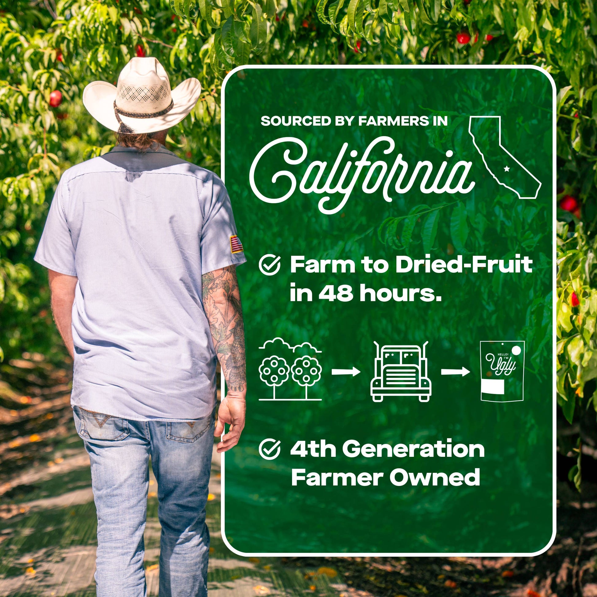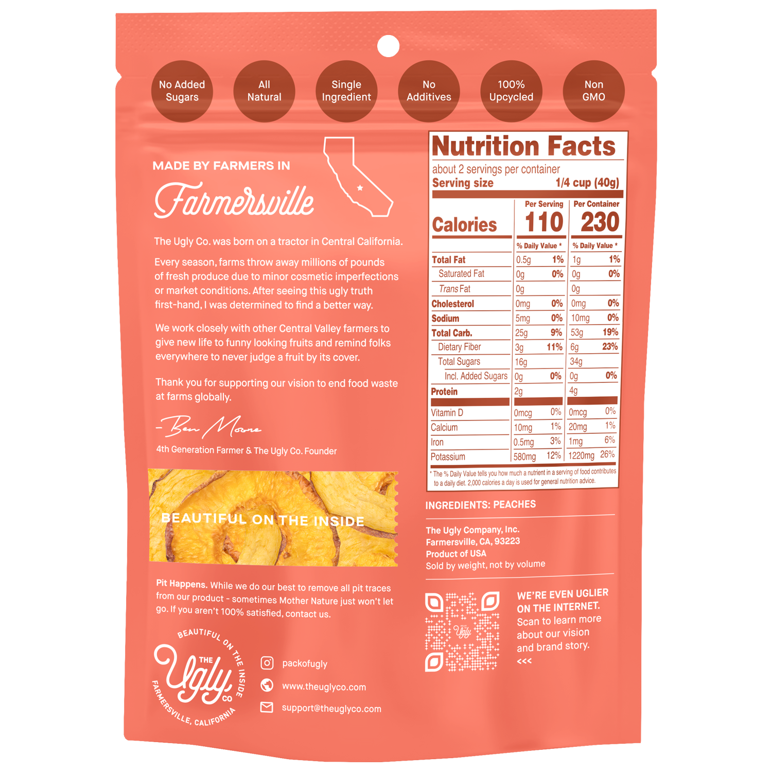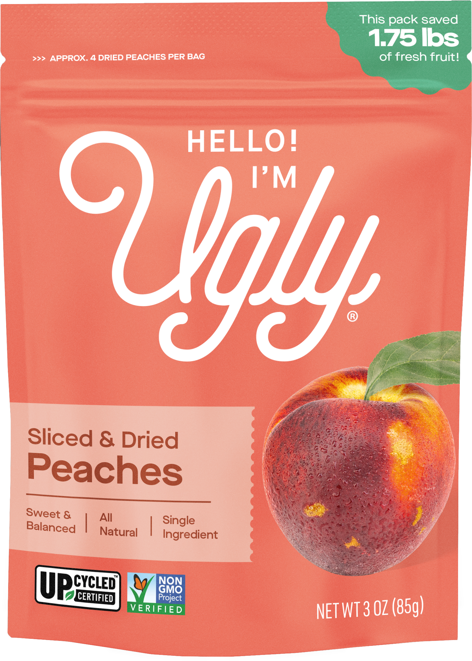 Our Hello! I’m Ugly Dried & Sliced Peaches is a Sweet & Balances dried fruit snack grown and dried in the Central Valley of California. Using fresh Peaches from local farms, this snack goes from tree to dried fruit in under 48 hours. This healthy snack is all-natural with no added sugar, additives, or preservatives. Said simply, it’s just Peaches! The best part is it’s all sourced from ugly fruit that would be thrown away simply because of the way it looks. Every bag of our 100% Upcycled Dried & Sliced Peaches prevents food waste. Enjoy it for on-the-go snacking, a 2pm pick me up, or a healthy distraction during the day.
